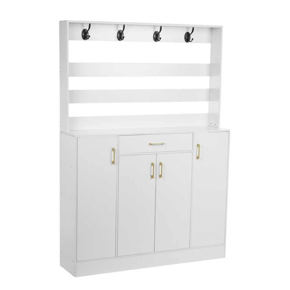 This product is a combination of shoe cabinet + coat rack. Buying this product is equivalent to owning these two things at the same time. You will find it very cost-effective. The integrated storage cabinet is made of a combination of thick plates, stable structure, not easy to shake, don’t worry about the product shaking due to unevenness. The product has 1 drawer and 4 door cabinets to store shoes, socks, clothes, etc. Then there is a large countertop where you can put your keys, bags, photo albums, vases and other items.