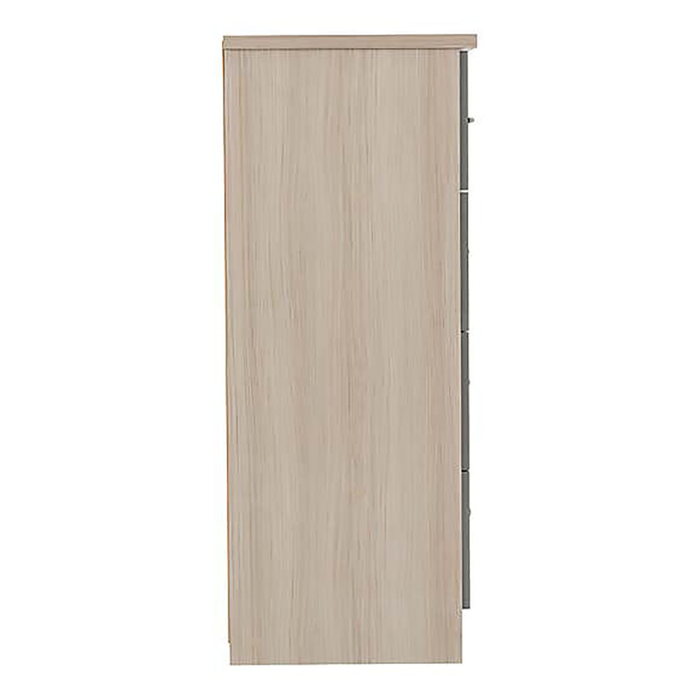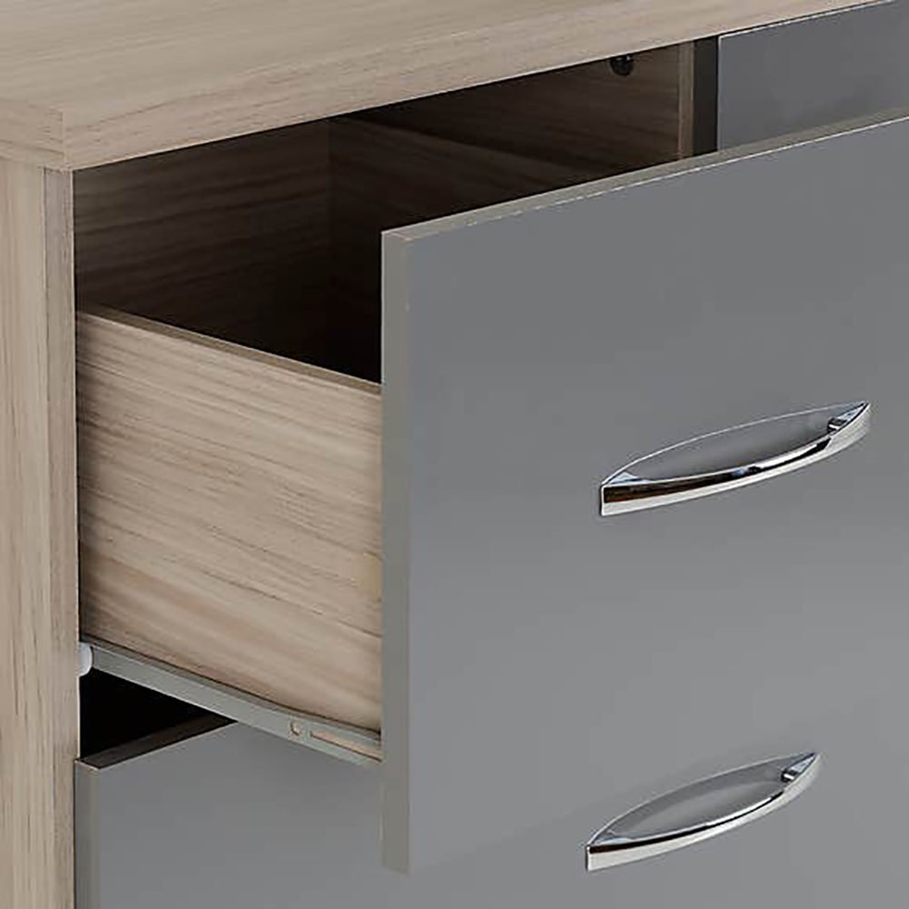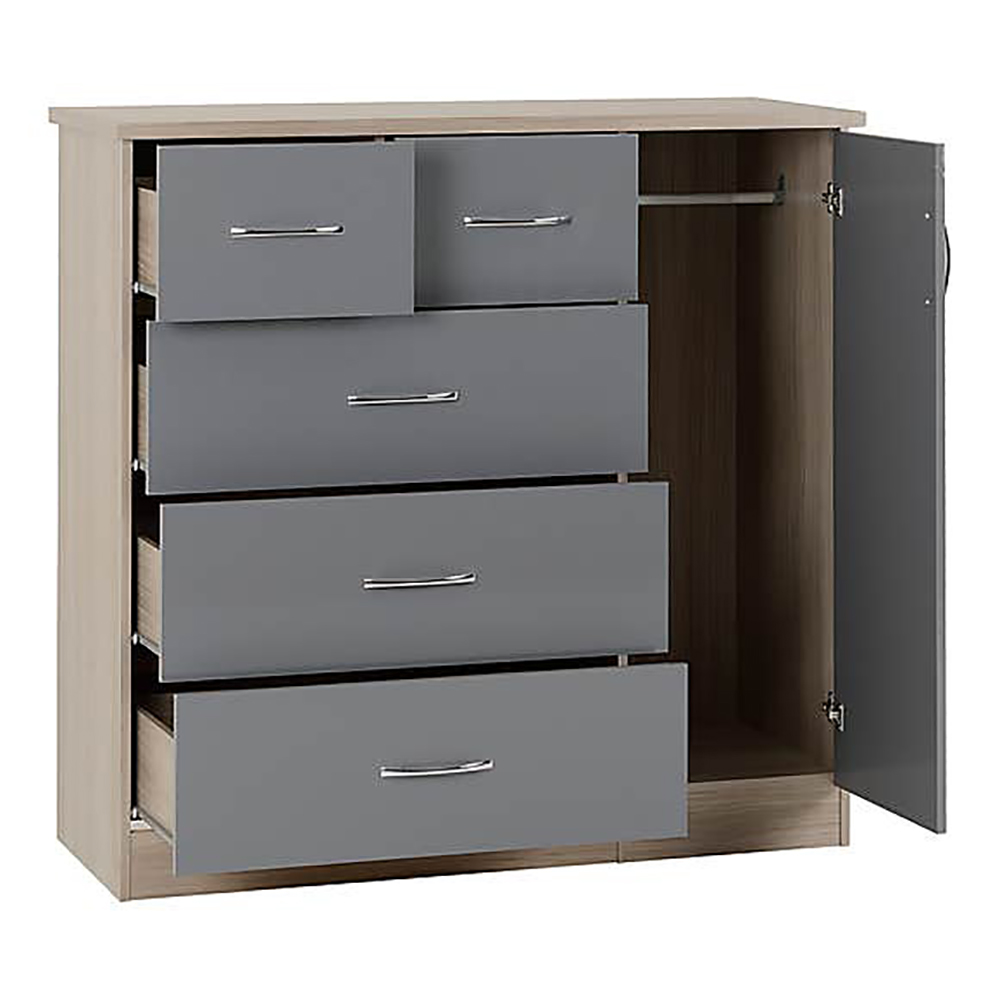 The BAF Grey 5 Drawer Compact Wardrobe features a contemporary design owing to the gray finished front which contrasts perfectly with the light oak veneers. The Nevada has your storage needs covered thanks to the five drawers and hanging space from the metal rail.
