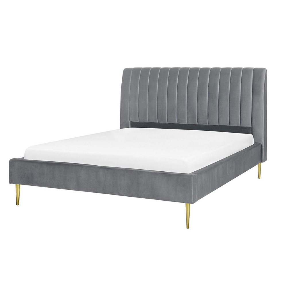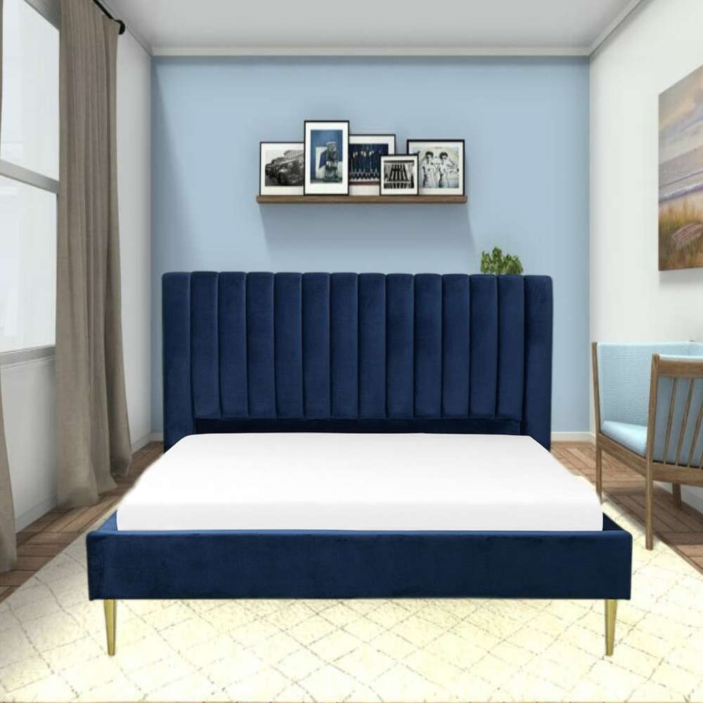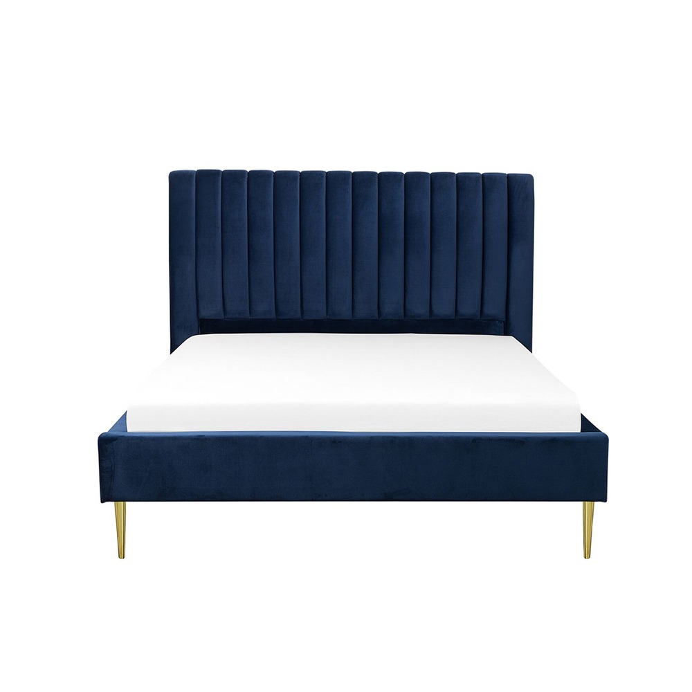 An elegant Blue Velvet bed in a contemporary design that features a high, thickly padded headrest. The rectangular shape of the bed gives a traditional look, but combined with vertical lines on the headrest it also creates a modern vibe. The legs are perfectly proportioned and do not draw attention away from the chic design, but ensure a strong, sturdy and durable construction.