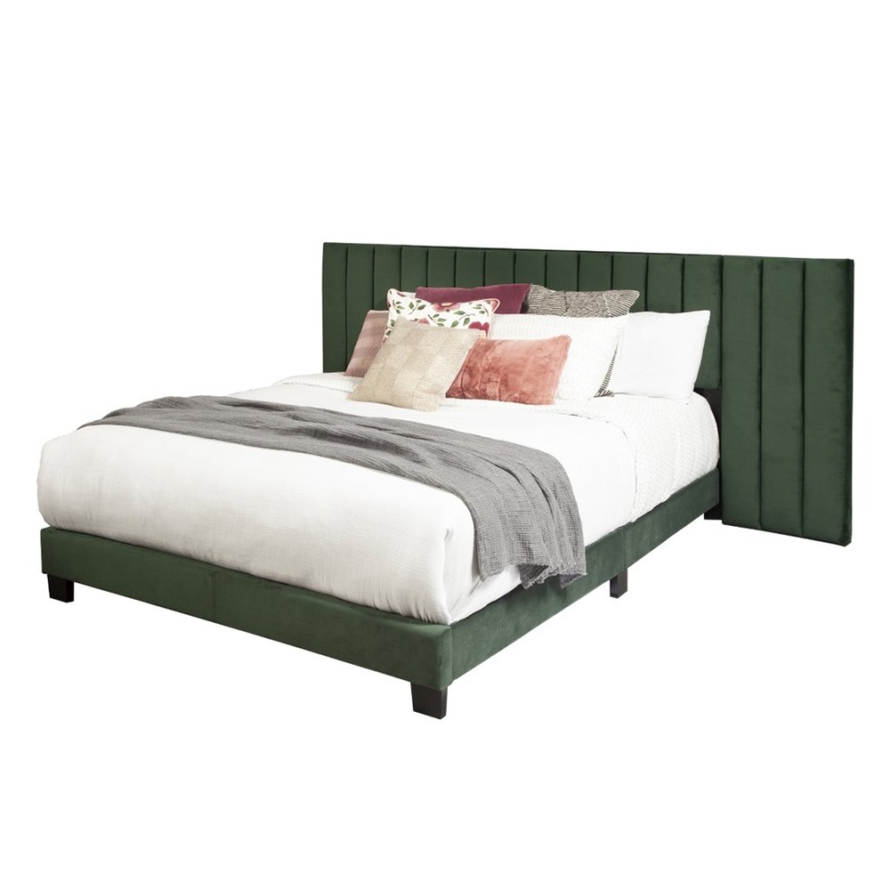 Create a statement in your bedroom with an extended wall Upholstered bed. Founded atop a solid and manufactured wood frame, this design features soft fabric in vertical channels for modern details that are easily at place in almost any room.