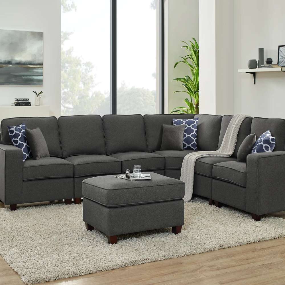 This beautiful 7-piece modular sectional sofa comes with an ottoman and will fit into any living room and impress your guests. The comfortable dark gray linen fabric with matching accent pillows will light up your living room with the most trendiest of looks. The size will allow you to welcome multiple guests where everyone will be able to enjoy entertainment together.