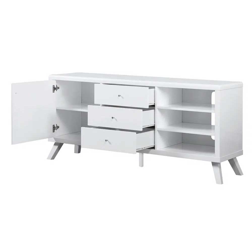 Clear lines with round handles easily fit in well with most home decors. It has 3-tier open shelves in the right to store your CDs, remotes or magazines and 1 cabinet to keep your room clear. The legs give a light airy look and make it easy to clean the floor underneath. This TV stand is the perfect blend of quality craftsmanship, brilliant design, and purposeful functionality. Featuring 3 open shelves, 3 drawers and one hidden cabinet to create the ultimate storage for stashing DVDs, board games, electronics, and media accessories