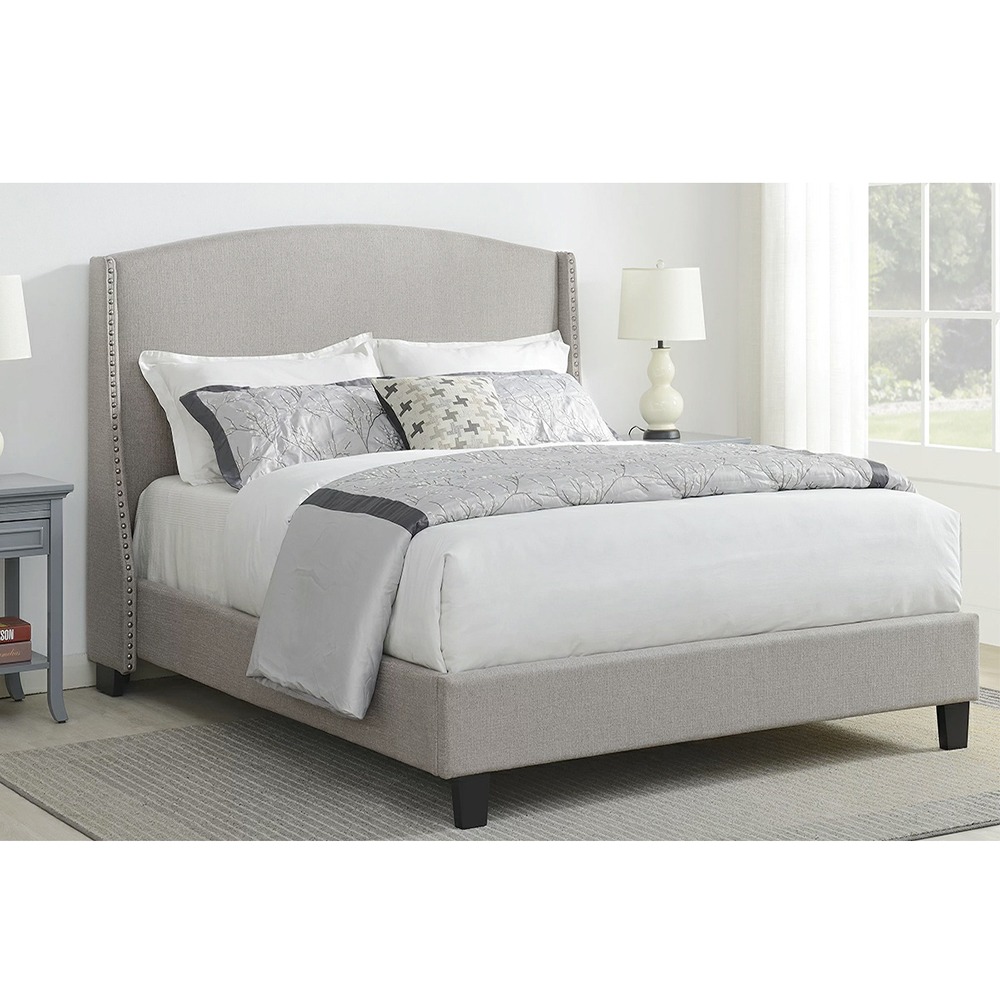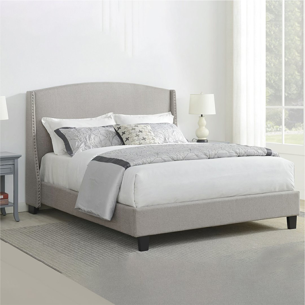 Elevate your bedroom with this elegant bed. This unique wingback bed frame features a nail head trim over smooth linen fabric. The light color will accentuate your transitional home d?cor elegantly. The plush foam padding adds comfort and support to the bed frame.