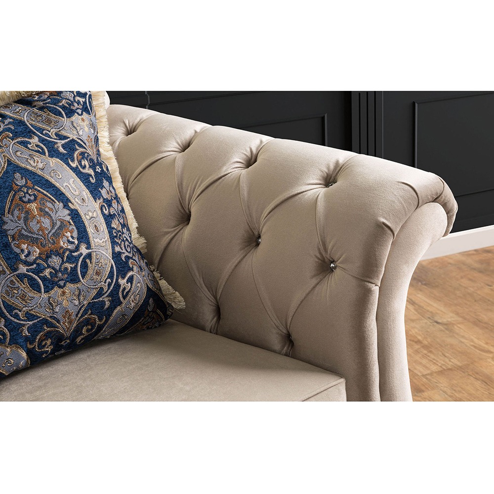 Leave a lasting impression with this timeless reimagining of the chesterfield sofa. Cues from the classic design are kept with essential changes to bring it to the modern day. The reverse camelback seat and arms are deeply tufted with acrylic buttons, and the premium fabric used is in a regal shade of light mocha. Matching pillows with intricate pattern are included. Optional chair and loveseat are available.