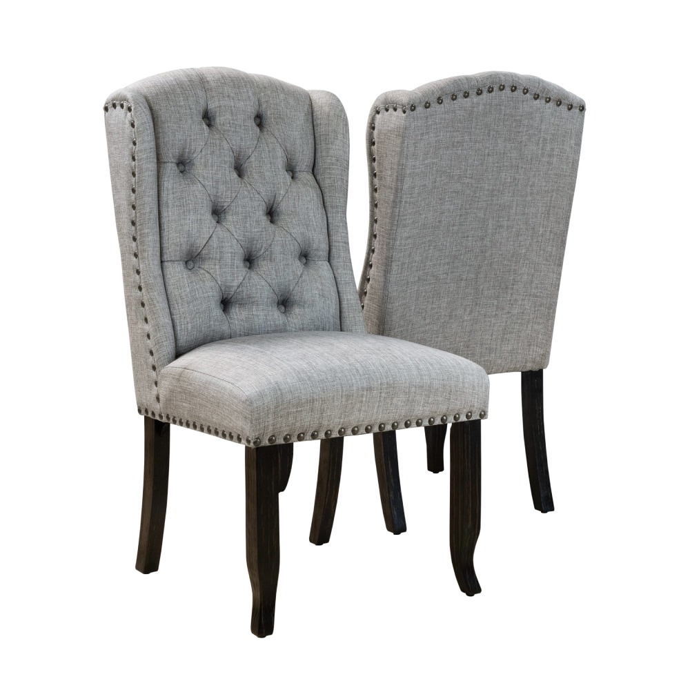 Freshen up your farmhouse decor with these traditional Rustic Linen Dining Chairs from Furniture of America. The espresso-finished frames feature button-tufted wingback seats, upholstered with linen-look polyester for easy upkeep. Choose from five unique upholstery colors, each accented with brass nail head trim.