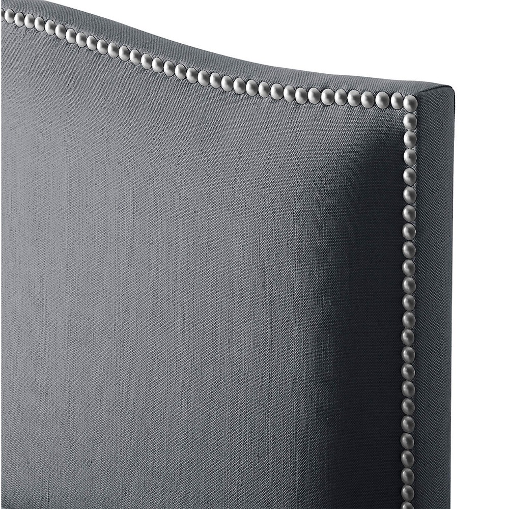 This Simple fabric upholstered bed brings grace and sophistication to the bedroom with an understated curved camelback in a soft natural linen blend, finished with signature brushed pewter nailheads applied by hand one at a time. This Upholstered Fabric Bed solid curved legs are finished in black.