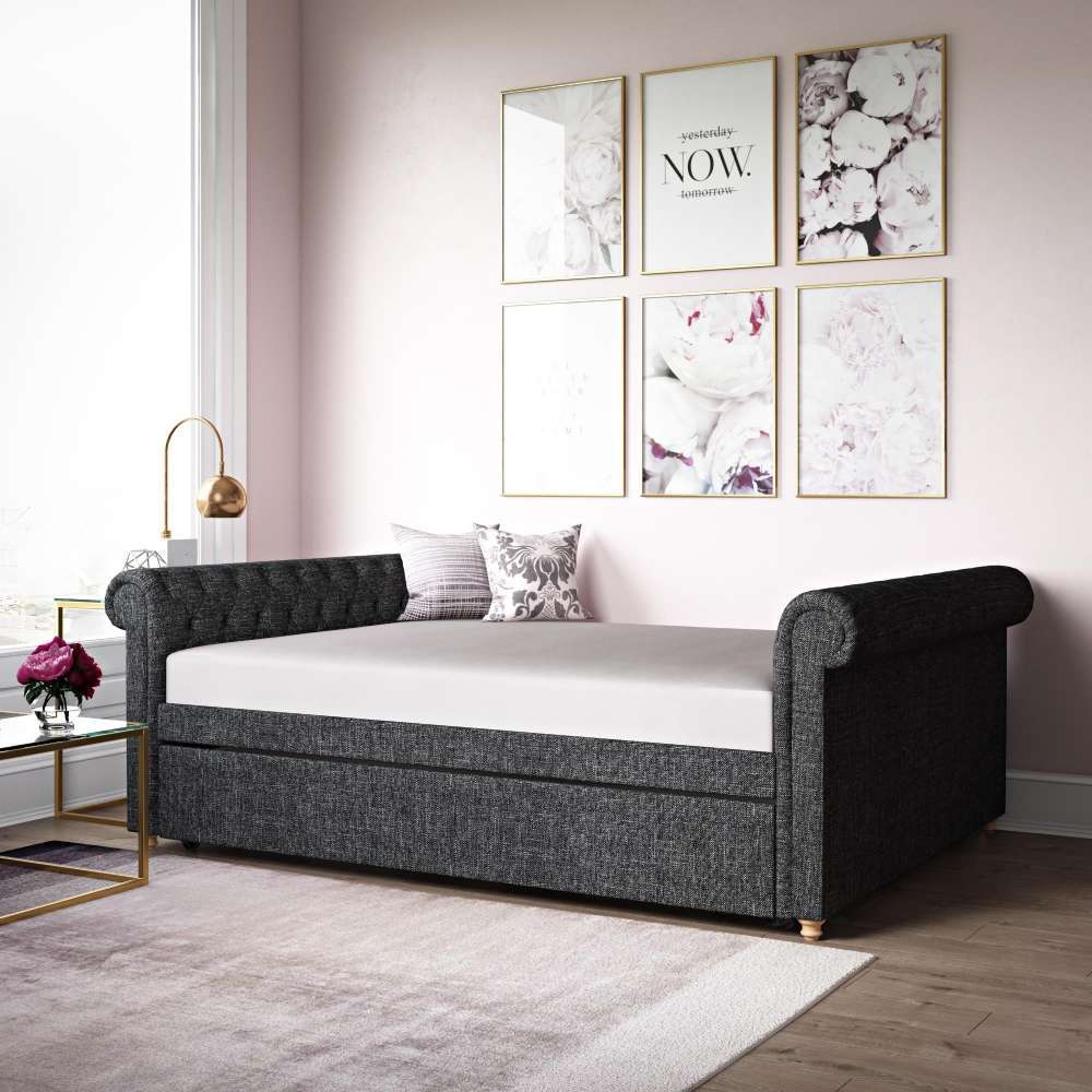 Add a touch of elegance and charm with our Avenue Greene Stacy Upholstered Daybed and Trundle. Fused with a modern flair and a timeless Victorian look, this daybed is practical for any living room, bedroom or guest room. Featuring a backless design and slightly sleighed arms, we guarantee this piece is not only charming but also practical. Simply roll out the trundle to benefit from an extra sleeping space – ideal when accommodating overnight guests.