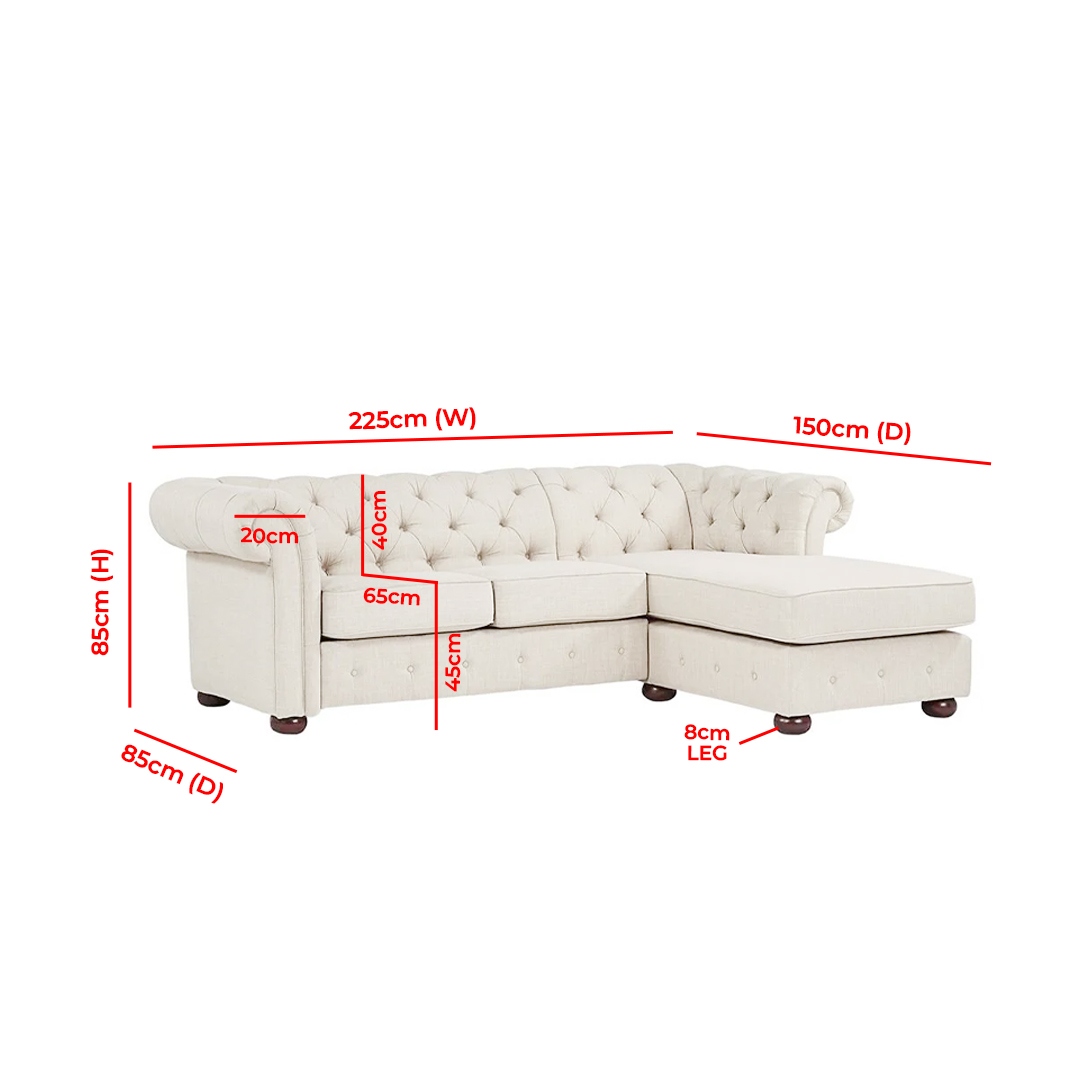 Add luxurious seating to your living area with the chesterfield 3-seat sofa and chaise from BAF. Button tufting along the low rolled back and arms add timeless sophistication to the design. The right or left-facing chaise is perfect for kicking back and watching TV or reading a book. Available in beige, grey, or dark grey linen upholstery.