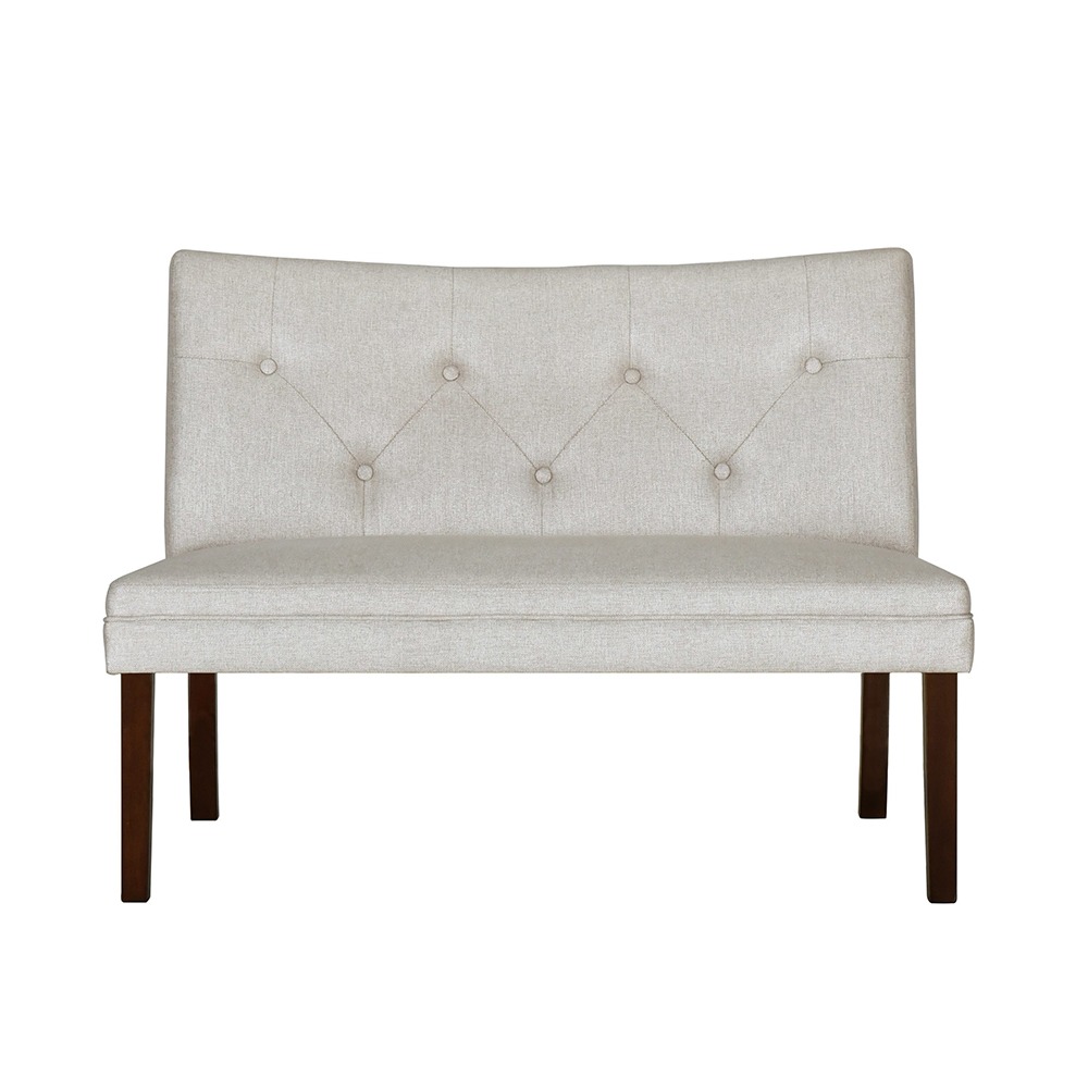 Upholstered, modern style settee, ideal as an accent piece. The button tufts add a touch of elegance. It’s simplicity and neutral color make it the perfect addition to any living space in the home.