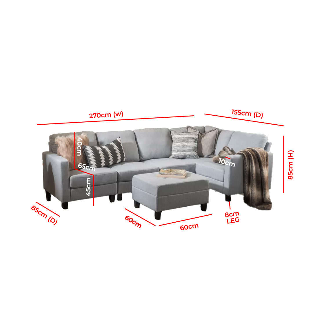 - Dimensions overall: 270cm W x 155cm D x 85cm H